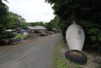 「祝梅温泉」 お湯はヌルヌルのモール泉。 温度が高いとあったが、その前に若者が入っていて、温度は38℃でした。 そのため気持ちが良く、ゆっくり入れました。 敷地の入り口に、ポーリングの大きなピンが置いてありました。 |